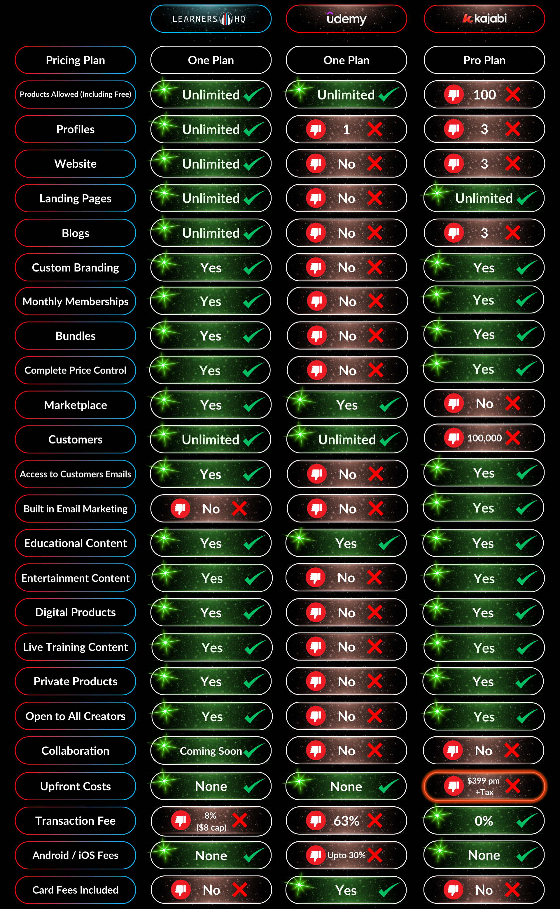 What I'm able to do with LearnersHQ in it's current form is great. Just the ability to create unlimited bundles and funnels is amazing for my business. With NO upfront cost. I look forward to seeing what they give us in the future.
